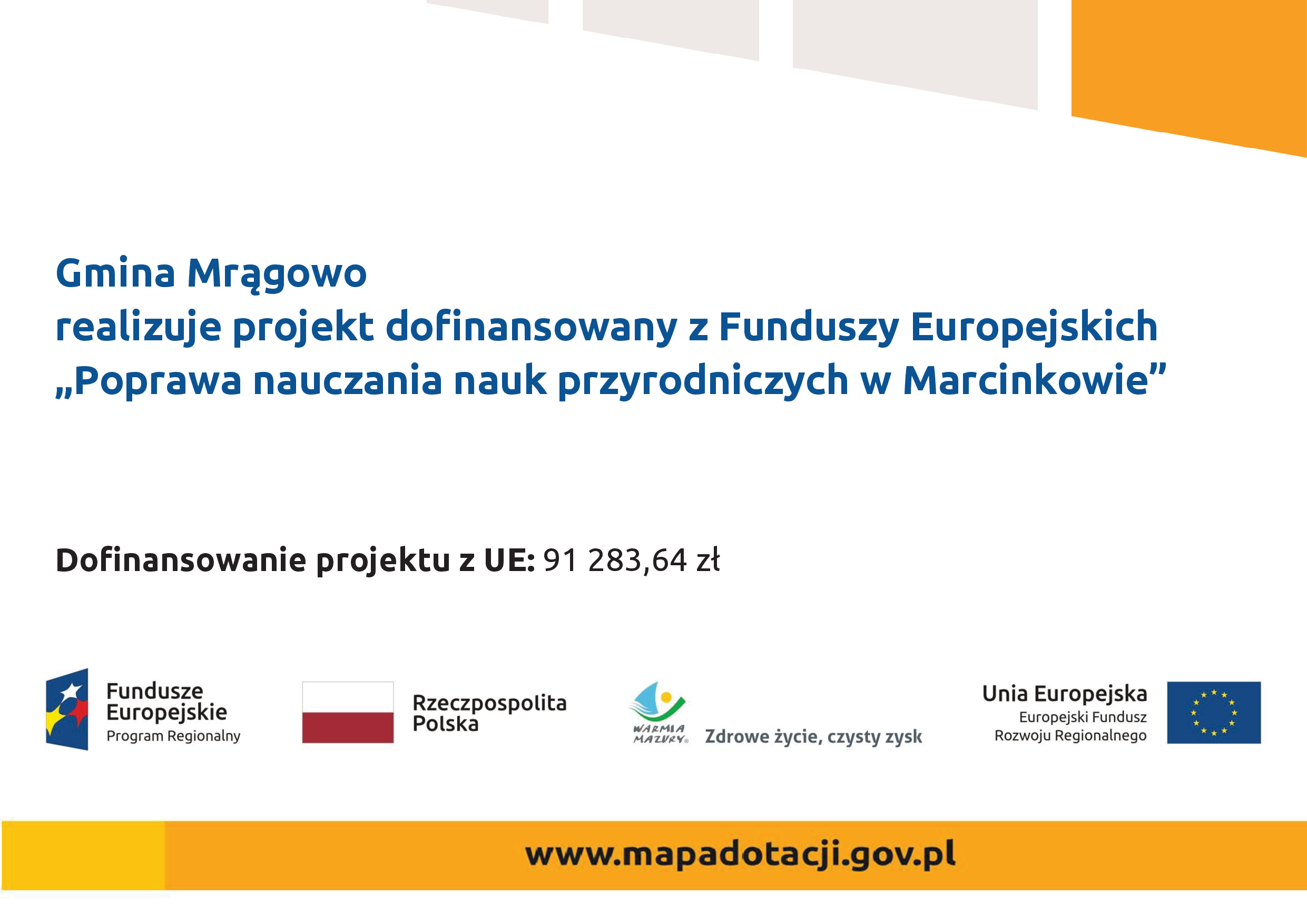 Gmina Mrągowo realizuje projekt dofinansowany z Funduszy Europejskich "Poprawa nauczania nauk przyrodniczych w Marcinkowie"