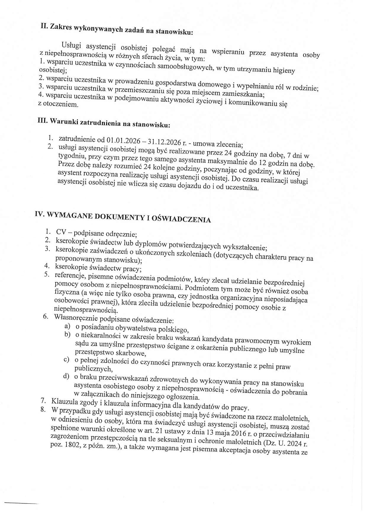 8. W przypadku gdy usługi asystencji osobistej mają być świadczone na rzecz małoletnich, w odniesieniu do osoby, która ma świadczyć usługi asystencji osobistej, muszą zostać spełnione warunki określone w art. 21 ustawy z dnia 13 maja 2016 r. o przeciwdziałaniu zagrożeniom przestępczością na tle seksualnym i ochronie małoletnich (Dz. U. 2024 r.