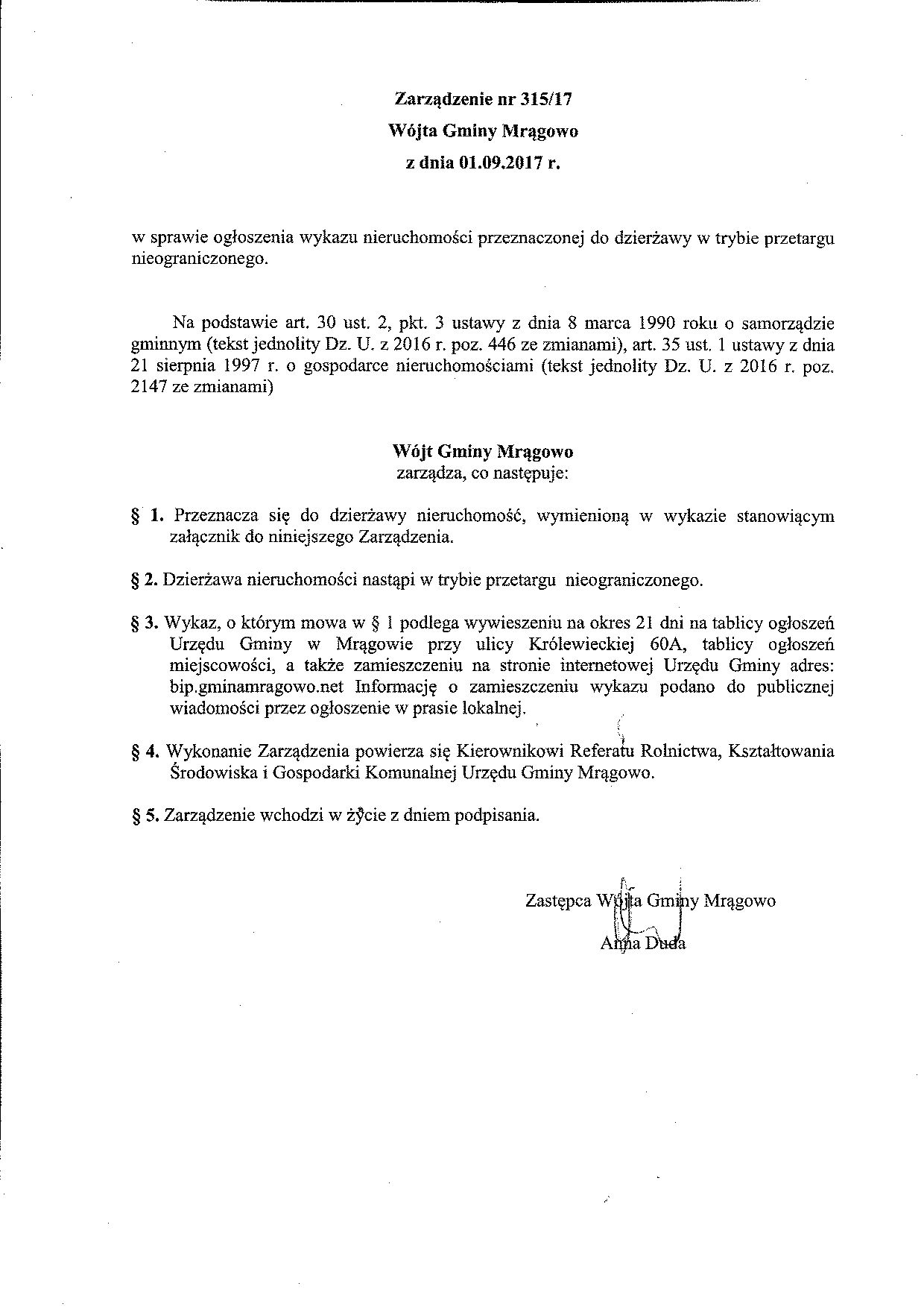 Zarządzenie nr 315/2017 Wójta Gminy Mrągowo w sprawie ogłoszenia nieruchomości przeznaczonej do dzierżawy w trybie przetargu nieograniczonego.