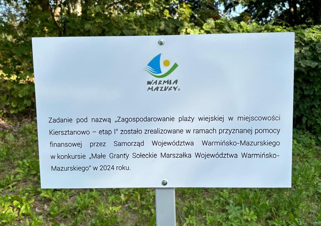 Zagospodarowanie plaży wiejskiej w miejscowości Kiersztanowo – etap I w ramach konkursu „Małe Granty Sołeckie Marszałka Województwa Warmińsko-Mazurskiego” w 2024 roku.