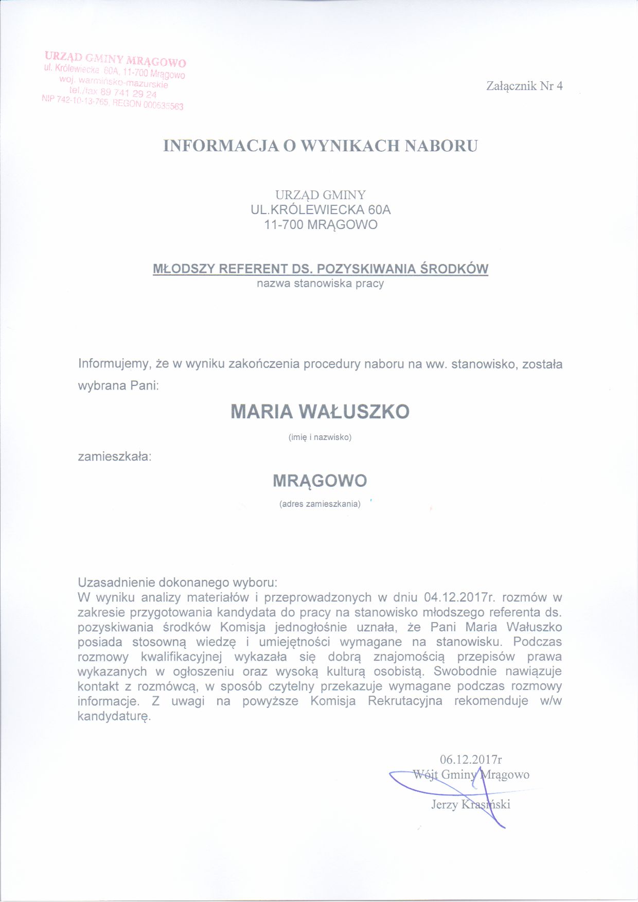11-700 Mrągowo, w zamkniętej kopercie oznaczonej imieniem i nazwiskiem kandydata z dopiskiem: "dotyczy naboru na stanowisko młodszego referenta do spraw pozyskiwania środków ", w terminie do dnia 30.11.2017r. do godz.10.00 (liczy się data wpływu do Urzędu Gminy Mrągowo).