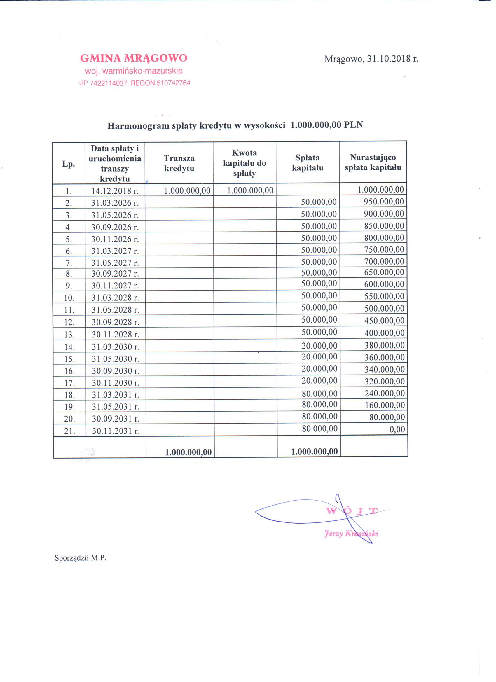 Udzielenie długoterminowego kredytu w wysokości 1.000.000 PLN na spłatę wcześniej zaciągniętych zobowiązań z tytułu zaciągniętych pożyczek i kredytów